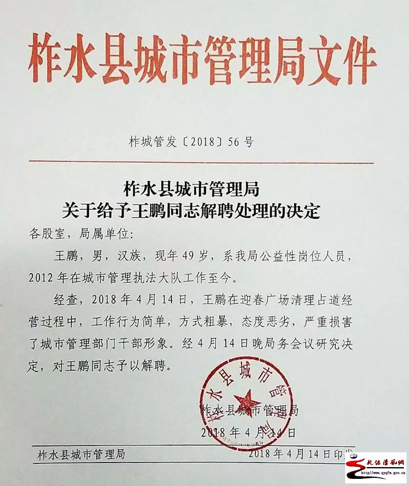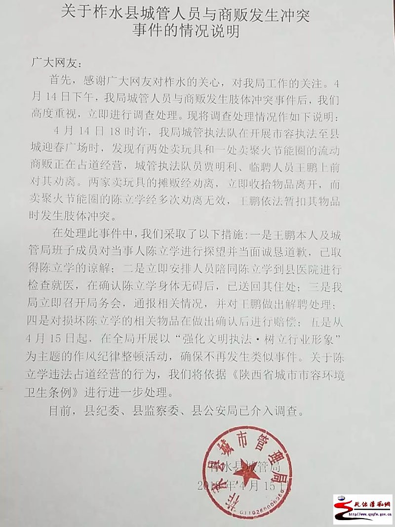| 广大网友: 首先,感谢广大网友对柞水的关心,对我局工作的关注。4月14日下午,我局城管人员与商贩发生肢体冲突事件后,我们高度重视,立即进行调查处理。现将调查处理情况作如下说明: 4月14日18时许,我局城管执法队在开展市容执法至县城迎春广场时,发现有两处卖玩具和一处卖聚火节能圈的流动商贩正在占道经营,城管执法队员贾明利、临聘人员王鹏上前对其劝离。两家卖玩具的摊贩经劝离,立即收拾物品离开,而卖聚火节能圈的陈立学经多次劝离无效,王鹏依法暂扣其物品时发生肢体冲突。 在处理此事件中,我们采取了以下措施:一是王鹏本人及城管局班子成员对当事人陈立学进行探望并当面诚恳道歉,已取得陈立学的谅解;二是立即安排人员陪同陈立学到县医院进行检查就医,在确认陈立学身体无碍后,已送回其住处;三是我局立即召开局务会,通报相关情况,并对王鹏做出解聘处理;四是对损坏陈立学的相关物品在做出确认后进行赔偿;五是从4月15日起,在全局开展以“强化文明执法 树立行业形象”为主题的作风纪律整顿活动,确保不再发生类似事件。关于陈立学违法占道经营的行为,我们将依据《陕西省城市市容环境卫生条例》进行进一步处理。 目前,县纪委、县监察委、县公安局已介入调查。